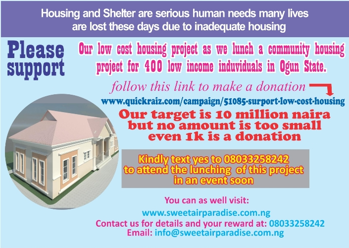 We are currently campaigning for the full launch of a community housing estate at Atan Ota Ogun State Nigeria. The units will be all rooms ensuite 2 bedrooms with a visitor,s toilet built 2 units on a plot of land of 60 by 120 feet With the following Amenities School Facility, clinic/Hospital, Shopping Mall, Cafe / recreational Center, Cash Point (ATM), Economic Employment Center etc